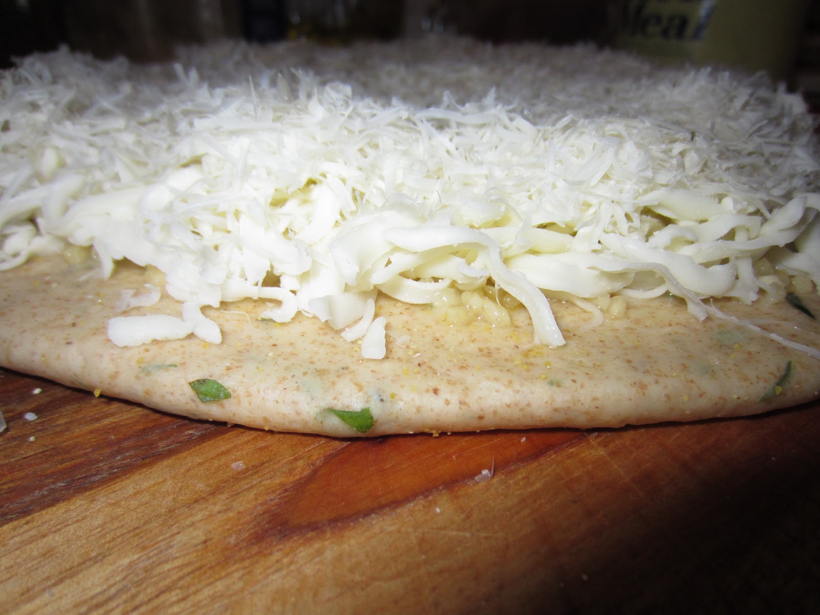 After my dough had risen for a couple of hours, I rolled it out into two small circles. I was a little frustrated with the recipe, because it didn't indicate how large these circles should be. I made an executive decision, based on the fact that it suggested each half of the pizza was one serving. I decided that they were going to be about ten inches.