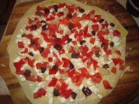 The Mediterranean pizza was together in no time. It was just a matter of sprinkling the dough with cheese, tomatoes, olives, and garlic. I was happy to still be using fresh garden tomatoes for this, too (I had picked the green ones and put them in the green house in a paper bag to ripen).